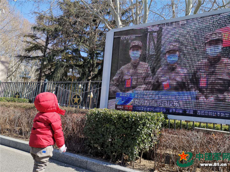 芊芊很想念媽媽。那天,芊芊拉著李亮的手在軍事醫(yī)學(xué)研究院辦公區(qū)門口等了很久,因?yàn)槟抢锏拇笃聊簧希瑫?huì)滾動(dòng)播放武漢戰(zhàn)“疫”官兵的視頻畫面。