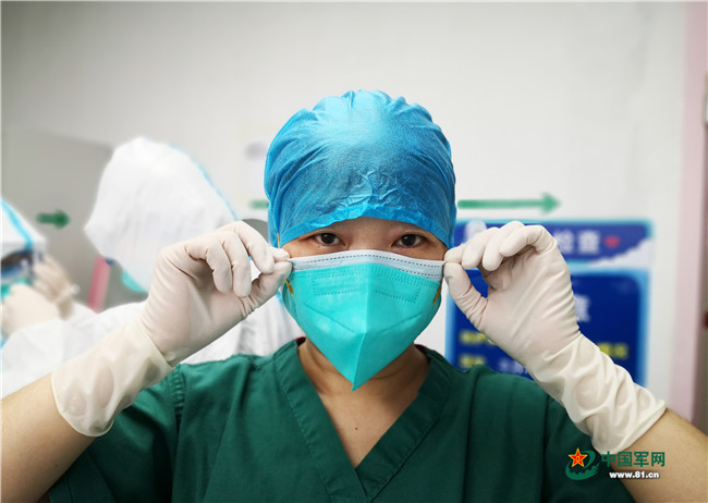 張紅霞正在穿戴防護用品,準備進入“紅區(qū)”。攝影:趙法勝