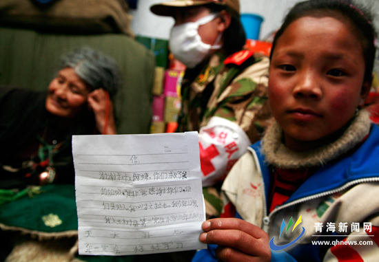 地震后,年僅12歲的才文拉毛給武警玉樹支隊官兵寫感謝信。
