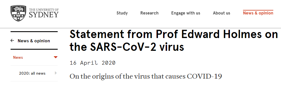 (霍姆斯參與的國際研究團(tuán)隊(duì)曾對新冠病毒基因組相關(guān)數(shù)據(jù)進(jìn)行分析,并于3月在英國期刊《自然·醫(yī)學(xué)》上發(fā)表文章稱,科研證據(jù)顯示新冠病毒是自然進(jìn)化的產(chǎn)物。)