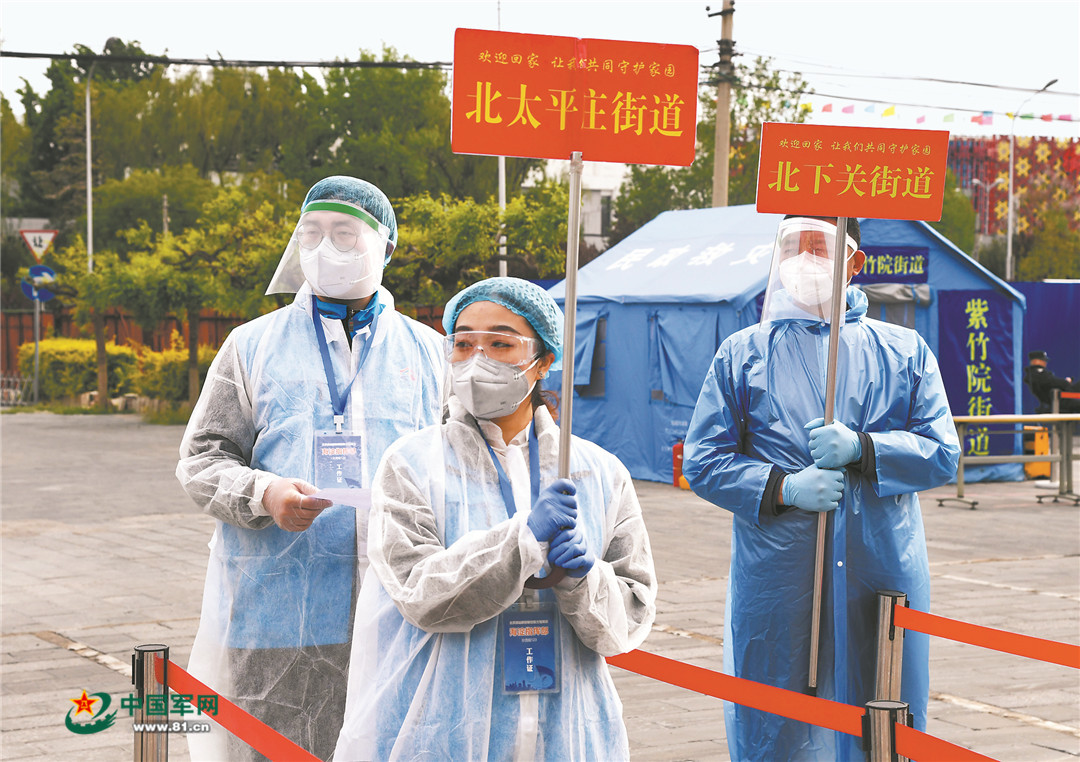4月25日,在北京市海淀區(qū)集中分流點,“青年防疫小分隊”隊員楊紫纓(中)和于平(左)在等待所屬街道的離鄂返京人員。新華社發(fā)