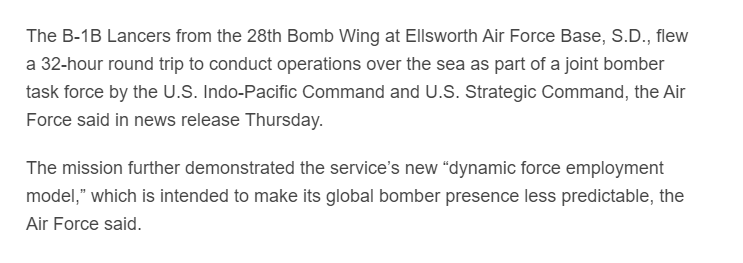 美國空軍表示,美軍兩架B-1B戰(zhàn)略轟炸機(jī)30日在南海飛行,是美國印度-太平洋司令部和美國戰(zhàn)略司令部轟炸機(jī)特遣隊聯(lián)合任務(wù)的一部分。此次任務(wù)進(jìn)一步驗證了美國空軍的新“動態(tài)武力運(yùn)用”作戰(zhàn)模式。該模式旨在讓美軍轟炸機(jī)在全球的存在與行動更難以預(yù)測。