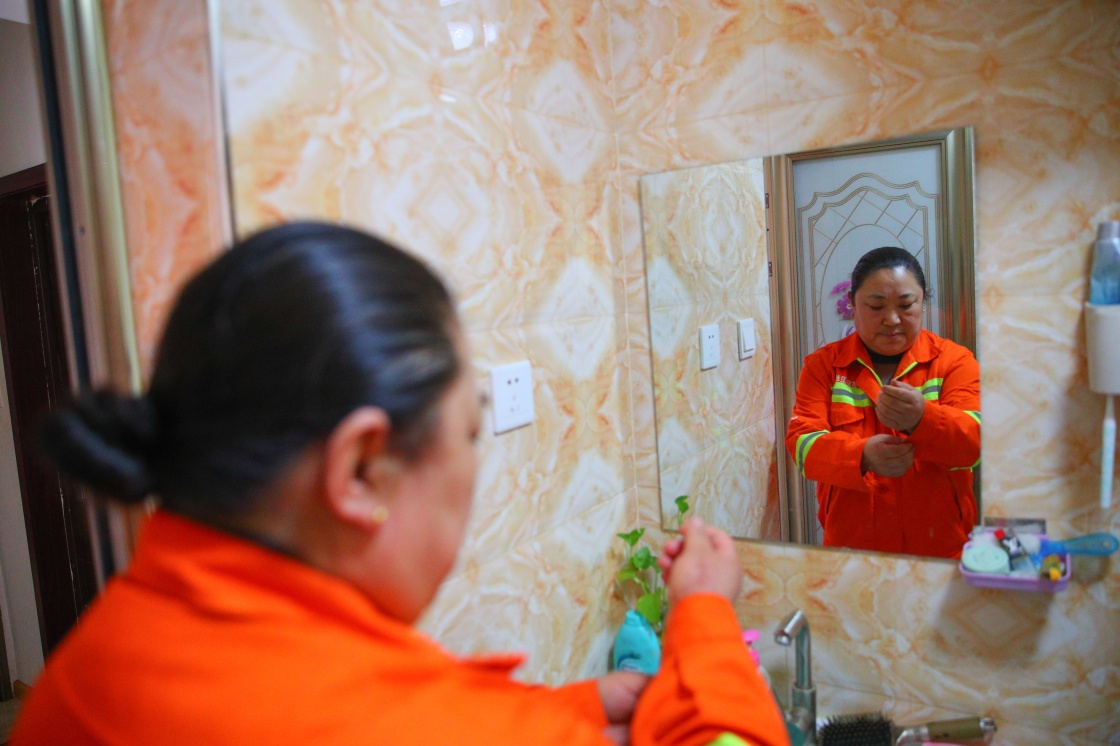 莊艷穿好工作服,準備出門工作(5月11日攝)。