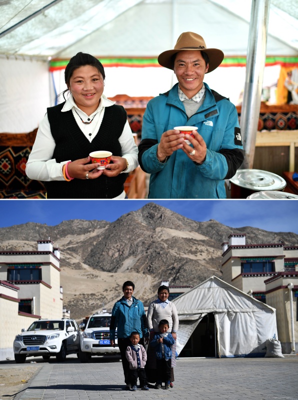 拼版照片上圖:在森布日極高海拔地區(qū)生態(tài)搬遷安置點(diǎn),格多(右)和妻子洛巴在展示自家打的酥油茶;下圖:在森布日極高海拔地區(qū)生態(tài)搬遷安置點(diǎn),格多(后左)和妻子洛巴及大兒子扎西尼瑪(前右)、小兒子普巴多杰在帳篷茶館前合影(照片均攝于4月15日)。