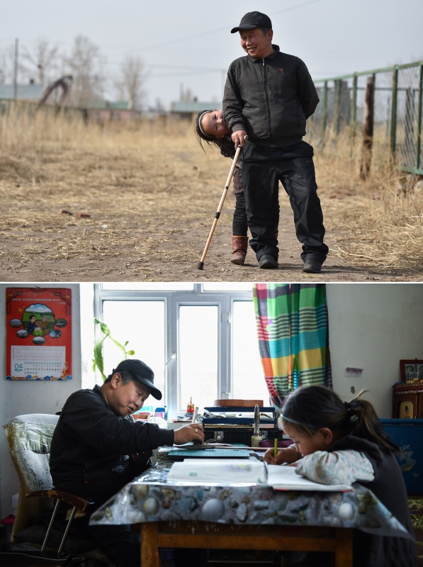 拼版照片上圖:在錫尼河鎮(zhèn)的出租房外,米格木爾(前)和女兒南吉樂瑪一起玩耍;下圖:在錫尼河鎮(zhèn)的出租房?jī)?nèi),米格木爾在進(jìn)行皮雕,女兒南吉樂瑪在溫習(xí)功課(照片均攝于4月15日)。