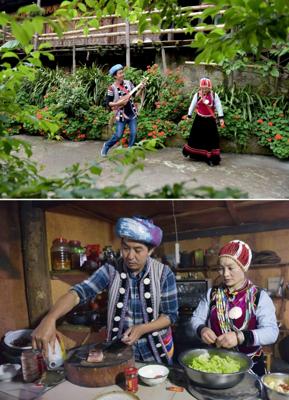 拼版照片上圖:郁伍林和魯冰花在客棧院子里彈唱歌舞(2017年5月27日攝);下圖:郁伍林和魯冰花為客人準(zhǔn)備晚餐(2017年5月26日攝)。