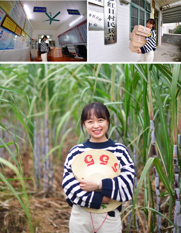 拼版照片上圖:扶貧干部鐘珍妮在東起鄉(xiāng)紅日村工作;