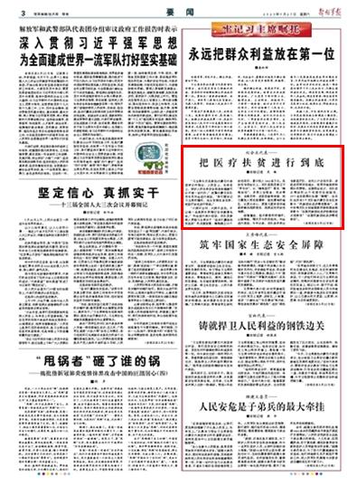 “習(xí)主席今天在參加內(nèi)蒙古代表團(tuán)審議時(shí)指出,人民至上、生命至上,保護(hù)人民生命安全和身體健康可以不惜一切代價(jià)。”武警內(nèi)蒙古總隊(duì)司令員劉會(huì)成代表說:“我們要牢記習(xí)主席的囑托,充分發(fā)揮自身優(yōu)勢,把醫(yī)療扶貧進(jìn)行到底。”
