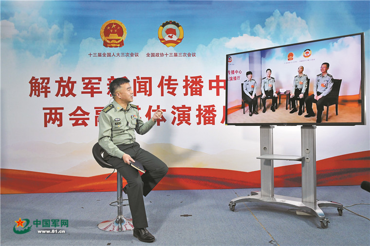 解放軍報(bào)記者孫興維通過(guò)視頻連線方式采訪軍隊(duì)人大代表。解放軍報(bào)記者 范顯海 攝