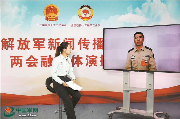 解放軍報(bào)記者張笑語通過視頻連線方式采訪軍隊(duì)人大代表尹東。蘇鶴攝