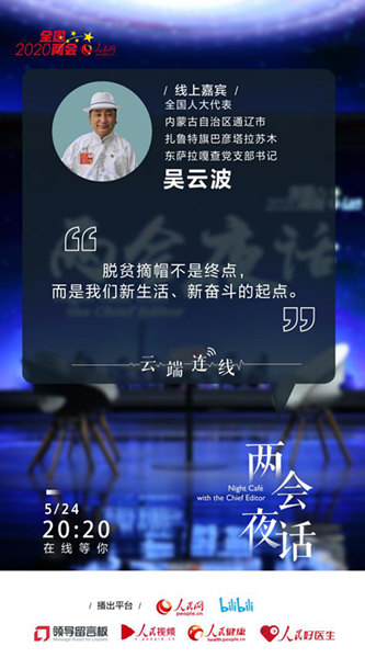 5月24日,人民網(wǎng)《兩會夜話》對話欄目正式開播,首期節(jié)目《為它下單!》中,人民網(wǎng)總編輯羅華、人民網(wǎng)青年編輯孫競與國務(wù)院扶貧辦社會扶貧司司長曲天軍,陜西省商洛市柞水縣常委、副縣長利斌,全國人大代表、內(nèi)蒙古自治區(qū)通遼市扎魯特旗巴彥塔拉蘇木東薩拉嘎查黨支部書記吳云波,“人氣主播”薇婭共同探討脫貧攻堅中的一支“奪寶奇兵”。
