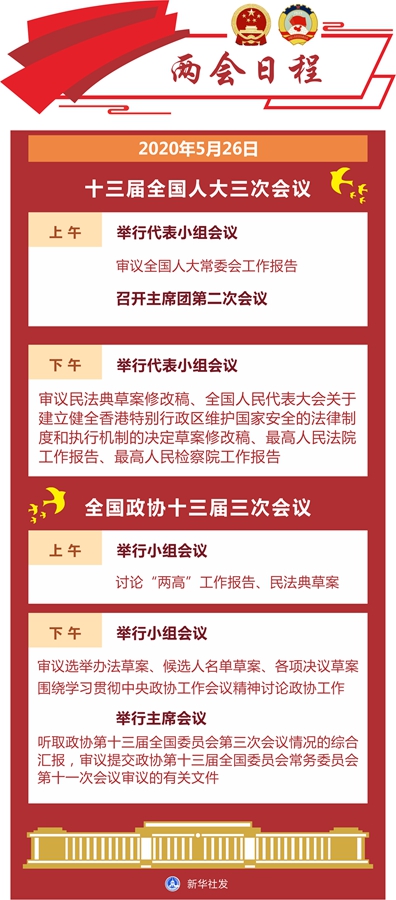 新華社北京5月25日電 十三屆全國人大三次會議26日上午舉行代表小組會議,審議全國人大常委會工作報告;11時召開主席團第二次會議。下午舉行代表小組會議,審議民法典草案修改稿、全國人民代表大會關于建立健全香港特別行政區(qū)維護國家安全的法律制度和執(zhí)行機制的決定草案修改稿、最高人民法院工作報告、最高人民檢察院工作報告。