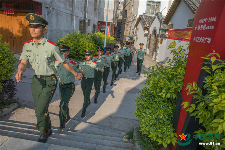 官兵們走進紅色文化廣場。果志遠 攝