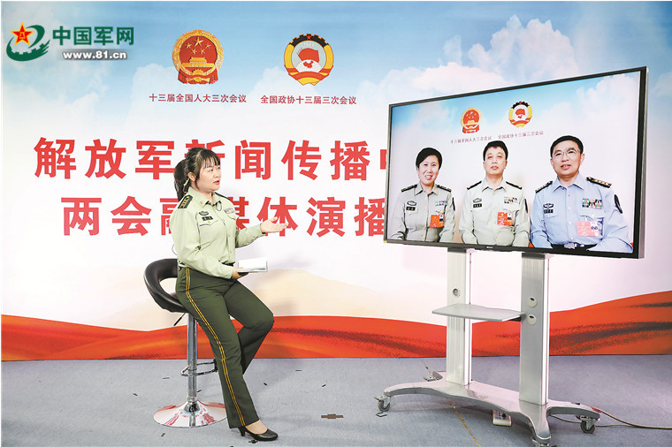 解放軍報(bào)記者吳敏通過視頻連線方式采訪軍隊(duì)人大代表。蘇鶴 攝