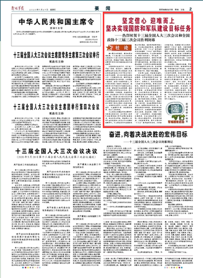 全國兩會的成功召開,對于進(jìn)一步統(tǒng)一思想、堅定信心、凝聚力量,鼓舞和動員全黨全軍全國各族人民更加緊密地團結(jié)在以習(xí)近平同志為核心的黨中央周圍,齊心協(xié)力做好當(dāng)前和今后一個時期各項工作,確保完成決戰(zhàn)決勝脫貧攻堅目標(biāo)任務(wù),全面建成小康社會,具有十分重要的意義。會議審議批準(zhǔn)的《政府工作報告》,通篇貫穿習(xí)近平新時代中國特色社會主義思想,貫徹黨中央決策部署,順應(yīng)了人民群眾對美好生活的向往,是一個旗幟鮮明、改革創(chuàng)新、求真務(wù)實的報告。表決通過的《中華人民共和國民法典》、《全國人民代表大會關(guān)于建立健全香港特別行政區(qū)維護國家安全的法律制度和執(zhí)行機制的決定》等,充分體現(xiàn)了黨的主張和人民意志的統(tǒng)一。出席會議的軍隊人大代表、政協(xié)委員,認(rèn)真履職盡責(zé),積極建言獻(xiàn)策,作出了應(yīng)有貢獻(xiàn)。