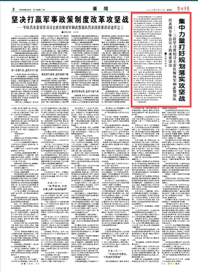 “今年是我軍建設(shè)發(fā)展‘十三五’規(guī)劃收官之年,要采取超常措施,克服疫情影響,集中力量打好規(guī)劃落實攻堅戰(zhàn),力保重大任務(wù)完成、戰(zhàn)略能力有大的提升。”習(xí)主席在出席十三屆全國人大三次會議解放軍和武警部隊代表團全體會議時發(fā)表重要講話,從實現(xiàn)中國夢強軍夢的高度,發(fā)出了打好我軍建設(shè)規(guī)劃落實攻堅戰(zhàn)的動員令、任務(wù)書,必將進一步匯聚起全軍官兵狠抓規(guī)劃落實、開創(chuàng)強軍事業(yè)新局面的磅礴力量。