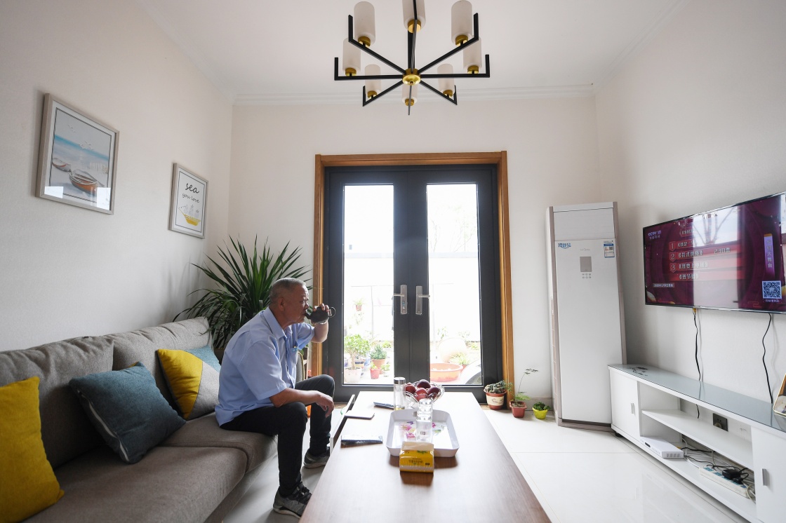 6月20日,在泗陽縣愛園鎮(zhèn)松張口社區(qū),65歲的楊新成在家中看電視。新華社記者 季春鵬