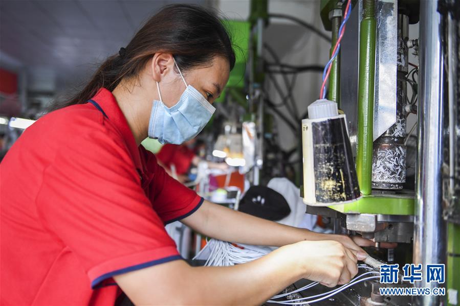 工人在廣西武宣縣一家生產(chǎn)電子產(chǎn)品的就業(yè)扶貧車間內(nèi)工作(6月18日攝)。