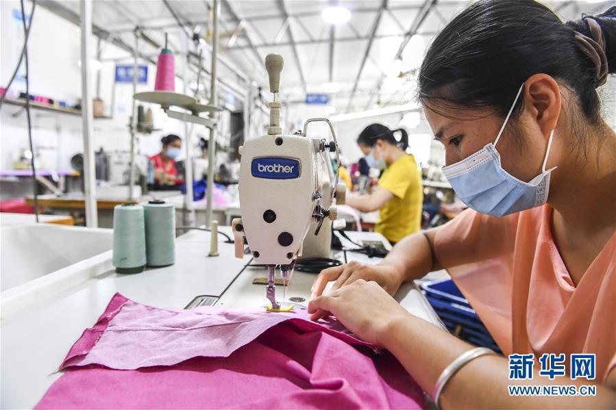 工人在廣西武宣縣一家制作服飾的就業(yè)扶貧車間內(nèi)工作(6月20日攝)。