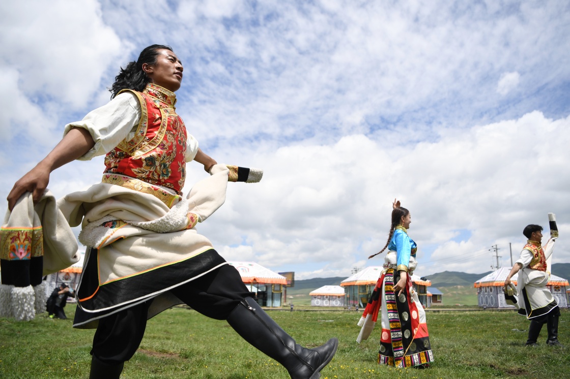6月20日,幾名藏族演員在甘南藏族自治州碌曲縣尕海鎮(zhèn)尕秀村帳篷城景區(qū)的草原上表演舞蹈。新華社記者 陳斌 攝