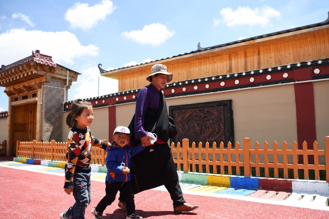 6月20日,在甘南藏族自治州碌曲縣尕海鎮(zhèn)尕秀村,村民格日扎西(右一)帶著孩子從村里走過(guò)。新華社記者 陳斌 攝