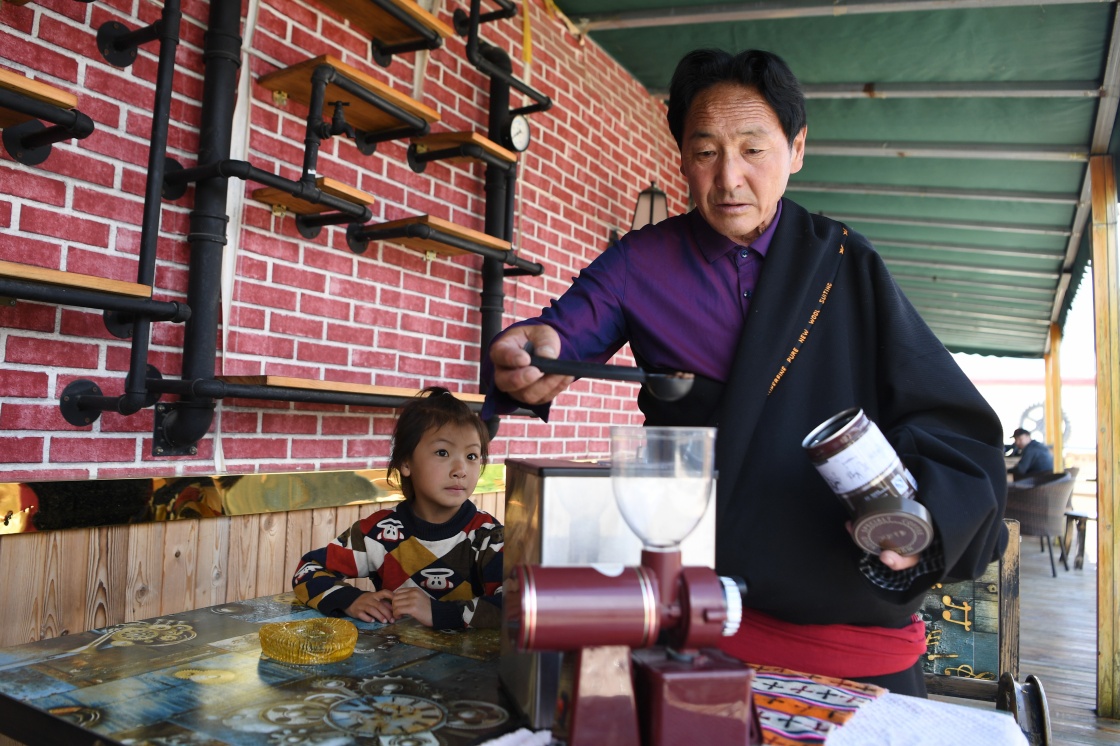 6月20日,在甘南藏族自治州碌曲縣尕海鎮(zhèn)尕秀村,村民格日扎西(右)在自家的牧家樂(lè)里調(diào)試新買(mǎi)的咖啡機(jī)。新華社記者 陳斌 攝