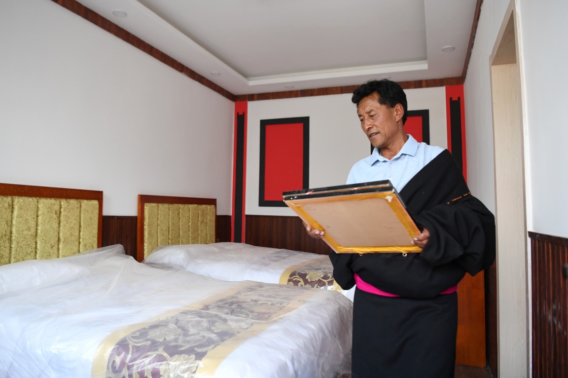 6月20日,甘南藏族自治州碌曲縣尕海鎮(zhèn)尕秀村黨支部書(shū)記拉毛加正在收拾自家開(kāi)辦的牧家樂(lè)客房。新華社記者 陳斌 攝