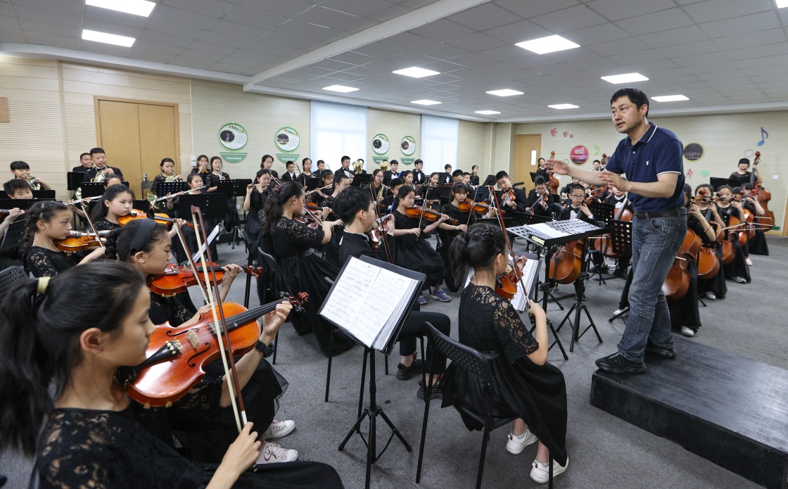 南豐小學(xué)永聯(lián)校區(qū)的管弦樂團在演奏中(6月19日攝)。該校80%的學(xué)生是外來務(wù)工人員的子弟,樂團成員也以這些外來務(wù)工人員子弟為主。新華社記者楊磊攝