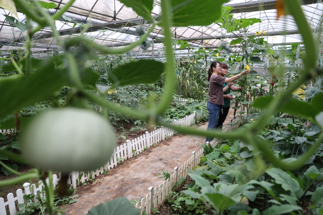 永聯(lián)村現(xiàn)代農(nóng)業(yè)基地開心農(nóng)場的兩名工作人員在打理作物(6月13日攝)。新華社記者楊磊攝