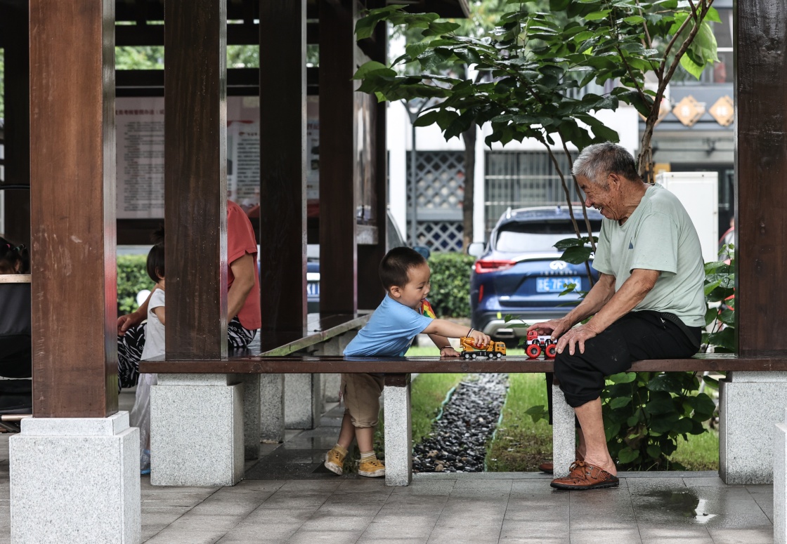來自安徽的74歲老人班保平(右)在居住區(qū)涼亭中與小孫子玩耍(6月13日拍攝)。他兒子在永聯(lián)村開店賣手機,并在永聯(lián)村購房定居下來。新華社記者楊磊攝