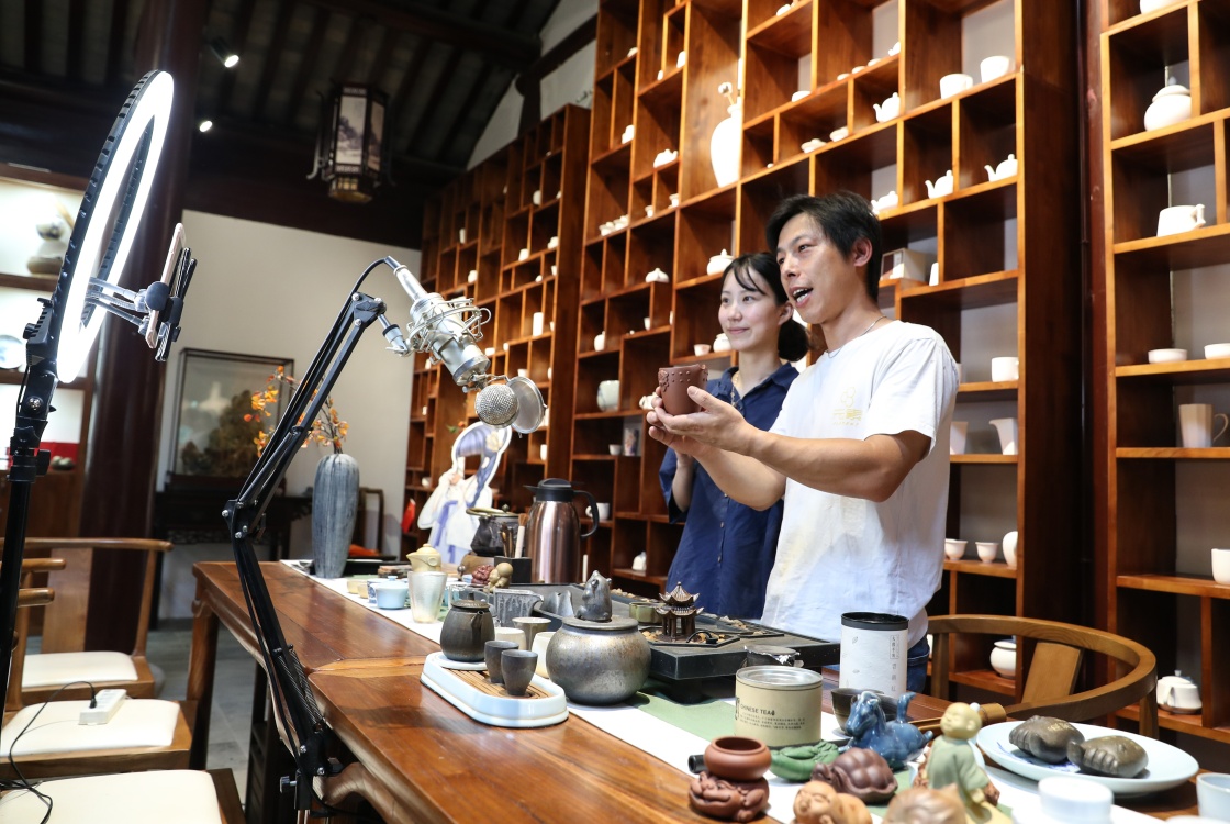 永聯(lián)村江南農(nóng)耕文化園窯藝坊的工作人員在直播銷售陶器(6月13日攝)。新華社記者楊磊攝