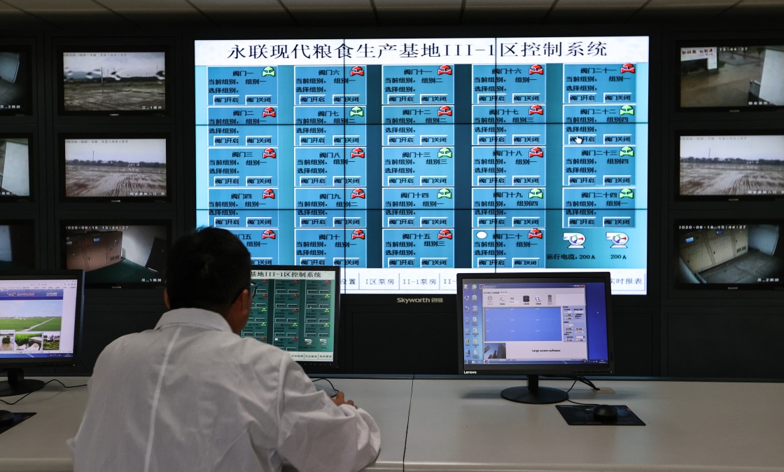 一名工作人員在永聯(lián)現(xiàn)代農(nóng)業(yè)生產(chǎn)基地操作生產(chǎn)(6月18日攝)。該基地只有10名工作人員,負責3000畝農(nóng)田的生產(chǎn)工作。新華社記者楊磊攝
