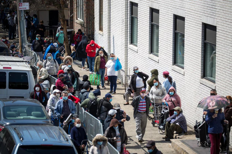 在美國(guó)紐約一個(gè)食品發(fā)放點(diǎn),人們排隊(duì)等待領(lǐng)取慈善組織發(fā)放的免費(fèi)食品。