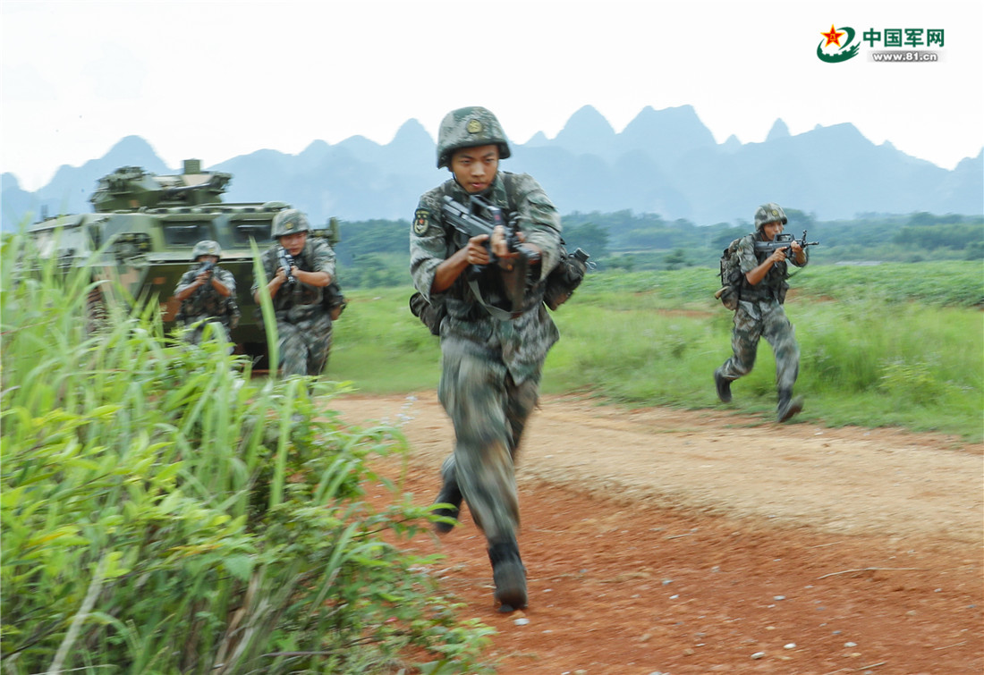 班戰(zhàn)術(shù)綜合演練中,為防“敵”重火器偷襲,裝步班與步戰(zhàn)車(chē)協(xié)同開(kāi)進(jìn)。黃遠(yuǎn)利 攝