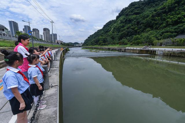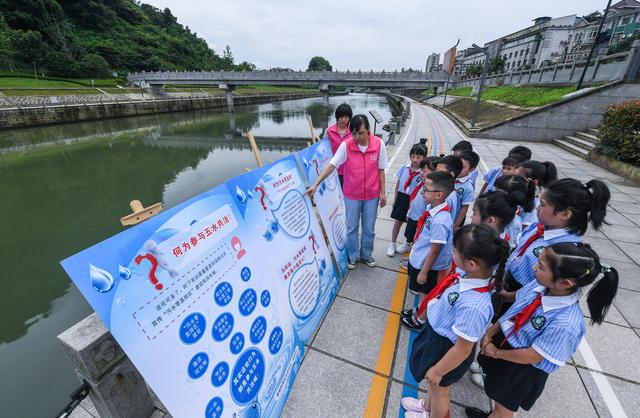 ↑6月28日,杭州市臨安區(qū)錦城街道紀檢部門的黨員在苕溪河邊給小學(xué)生們上“護水”環(huán)保課。