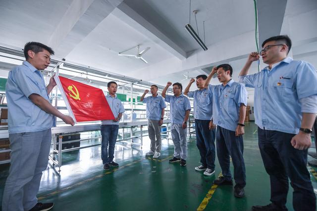 ↑6月28日,在杭州市臨安區(qū)錦城街道的浙江西盈科技股份有限公司內(nèi),黨員們在車間參加迎“七一”重溫入黨誓詞活動。