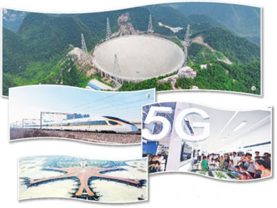 ①被譽(yù)為“天眼”的國家重大科技基礎(chǔ)設(shè)施500米口徑球面射電望遠(yuǎn)鏡。②中車長客股份公司生產(chǎn)的復(fù)興號中國標(biāo)準(zhǔn)動車組。③5G來襲,萬物智聯(lián)改變你我。圖為觀眾在重慶智博會參觀。④北京大興國際機(jī)場航站樓。新華社發(fā)