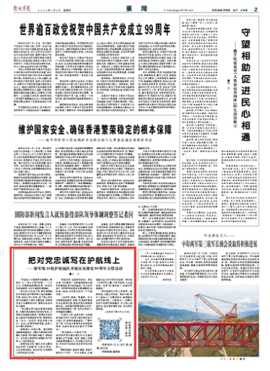 連日來,正在亞丁灣、索馬里海域執(zhí)行護航任務的海軍第35批護航編隊開展“身在大洋心向黨,亞丁灣上寫忠誠”慶祝建黨99周年主題活動,發(fā)揮黨員骨干先鋒模范作用,激勵任務官兵戰(zhàn)斗精神。