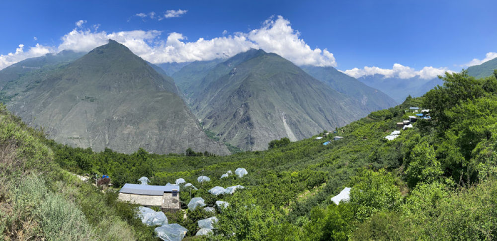在四川省阿壩藏族羌族自治州理縣桃坪鎮(zhèn)佳山村,村里大山高聳入云,從山下到山上則是蒼翠的果林(6月11日攝)。新華社記者 沈伯韓 攝