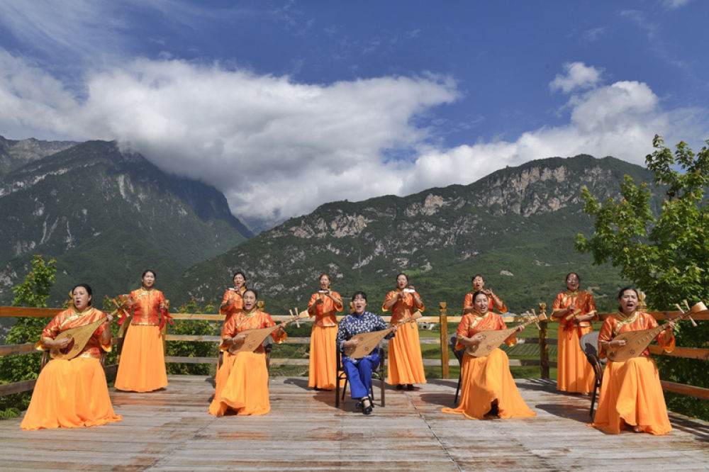 6月19日,四川省阿壩藏族羌族自治州九寨溝縣南坪鎮(zhèn)琵琶彈唱中心的藝人為游客彈唱南坪曲子《采花》。新華社記者 劉坤 攝