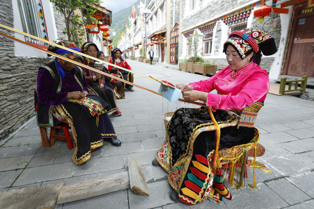在四川省阿壩藏族羌族自治州理縣古爾溝鎮(zhèn)丘地村,村民在藏式風格民宿外編織傳統(tǒng)腰帶(6月11日攝)。丘地村在2005年整體搬遷后,實現(xiàn)水電、畜牧、旅游產(chǎn)業(yè)齊頭并進,2019年成功創(chuàng)建3A級景區(qū),村民人均純收入達24780元。新華社記者 沈伯韓 攝