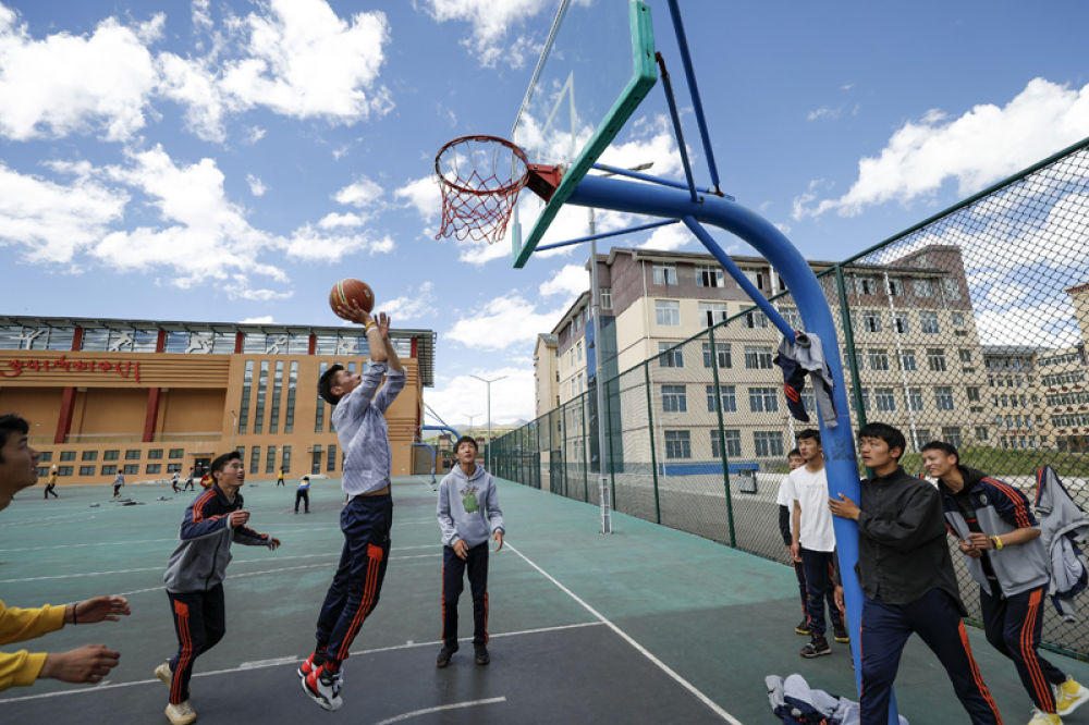 在四川省阿壩藏族羌族自治州阿壩縣藏文中學新的籃球場上,初中二年級男生在體育課上打籃球(6月14日攝),周圍則是新的教學樓和體育運動場館。新華社記者 沈伯韓 攝