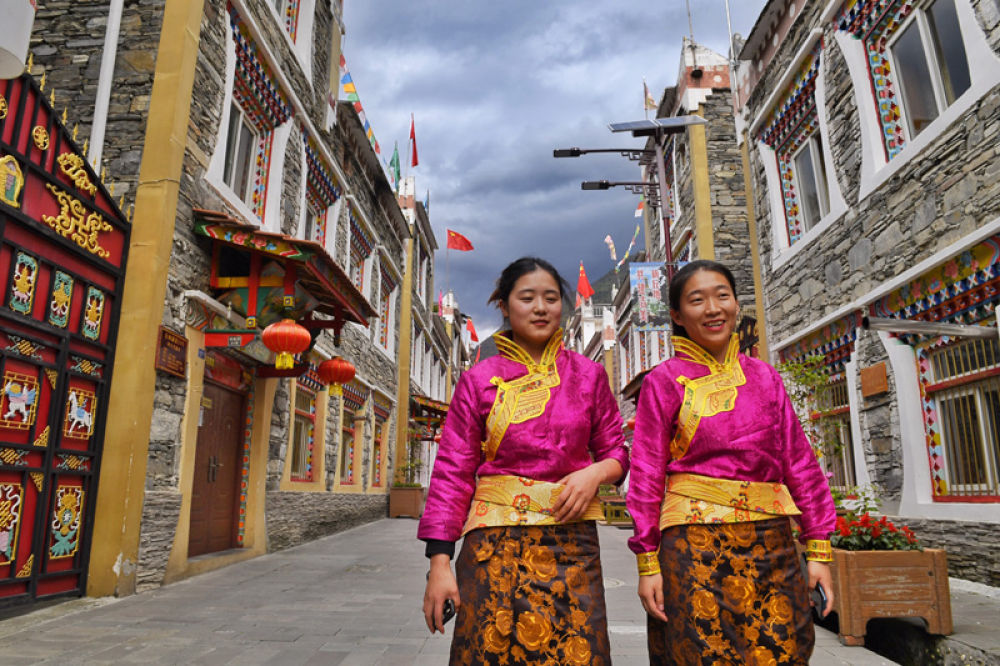 6月11日,同是經(jīng)營民宿客棧的四川省阿壩藏族羌族自治州理縣古爾溝鎮(zhèn)丘地村村民拉姆(左)和汪乃前往村口迎接客人。新華社記者 劉坤 攝
