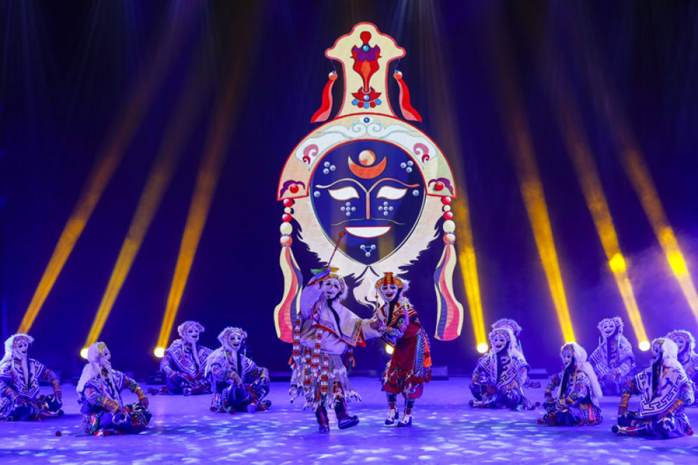 四川省阿壩藏族羌族自治州阿壩縣“蓮寶葉則”演藝公司演職人員在表演傳統(tǒng)曲種《折嘎》(6月14日攝)。折嘎是古老的曲種,如今被搬上舞臺,并在演唱中加入了傳遞吉祥、贊頌新人新事新風尚的內(nèi)容。這些演職人員中不少是從當?shù)剜l(xiāng)村里來的年輕人,經(jīng)過培訓合格后成為演員,通過表演獲得穩(wěn)定的收入。新華社記者 沈伯韓 攝