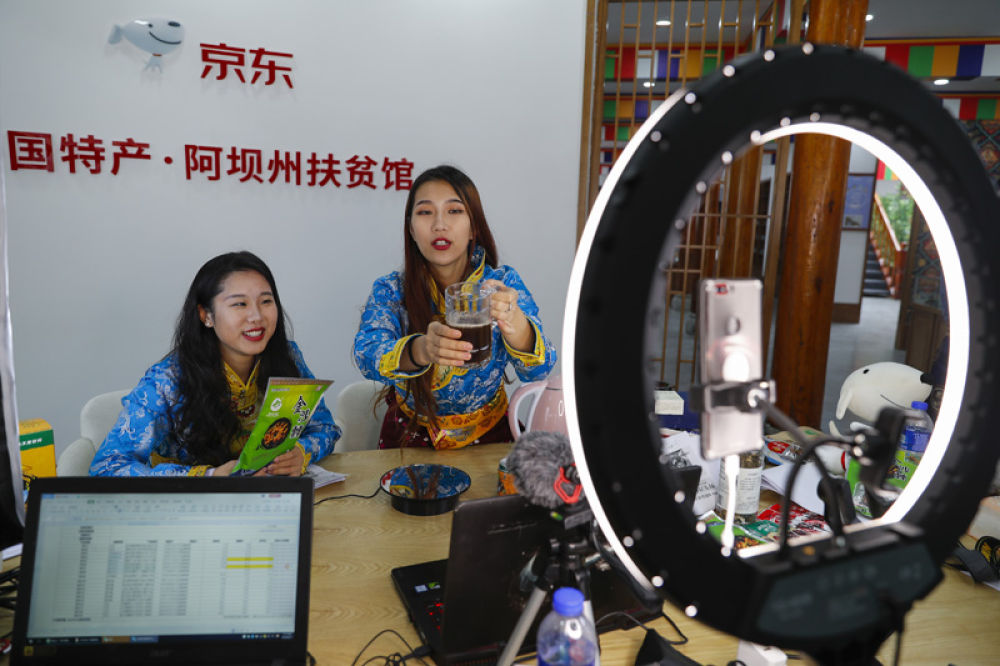 在四川省阿壩藏族羌族自治州松潘縣的“中國特產(chǎn)·阿壩州扶貧館”里,兩名從成都來到這里的MCN服務商團隊成員通過京東直播平臺,幫助松潘當?shù)仄髽I(yè)直播銷售沙棘飲料等特產(chǎn)(6月17日攝)。據(jù)了解,她倆直播3小時,幫助當?shù)仄髽I(yè)完成近10萬元的銷售額。新華社記者 沈伯韓 攝