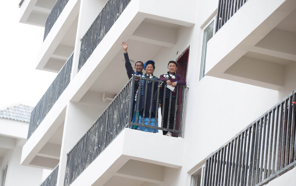 6月21日,在四川省布拖縣縣城易地扶貧搬遷集中安置點(diǎn) (依撒社區(qū)),來自特木里鎮(zhèn)乃烏村的社也小黑一家在新居招手。