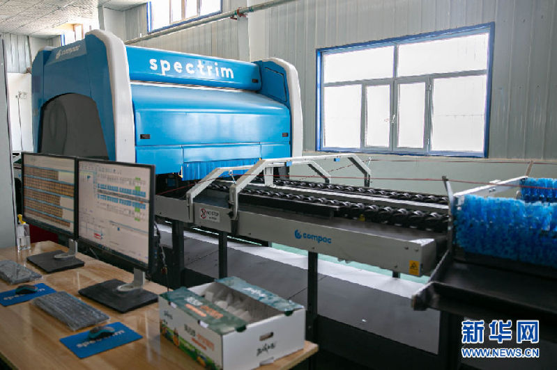 英吉沙當?shù)仄髽I(yè)內(nèi)的鮮杏分級分揀設備 新華網(wǎng) 杲均豐 攝