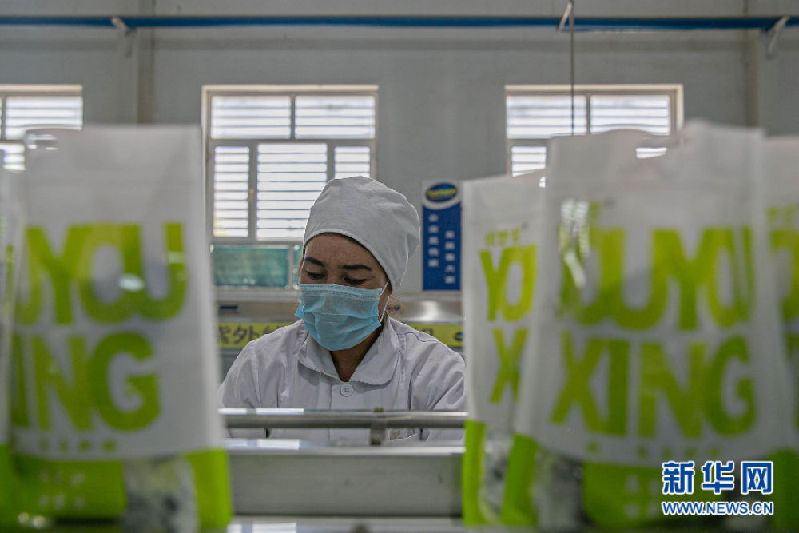 英吉沙當?shù)仄髽I(yè)進行杏制品包裝加工 新華網(wǎng) 杲均豐 攝