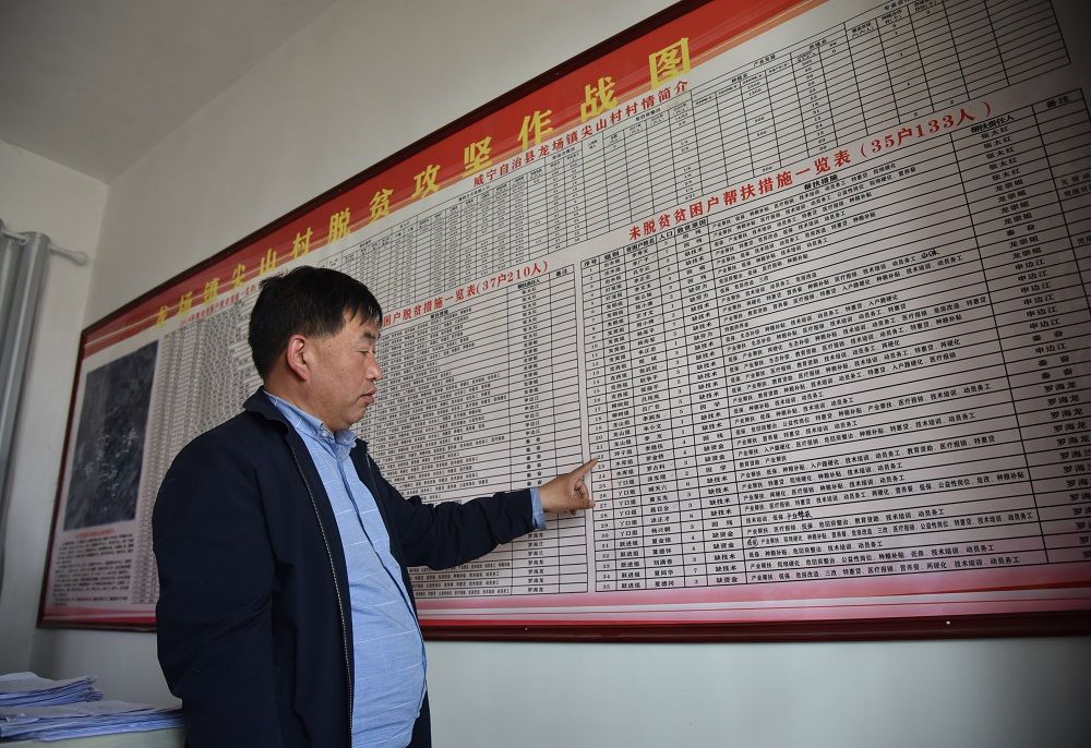 4月18日,對口幫扶威寧縣龍場鎮(zhèn)尖山村的該縣扶貧辦副主任唐勇查看扶貧情況。新華社記者駱飛 攝