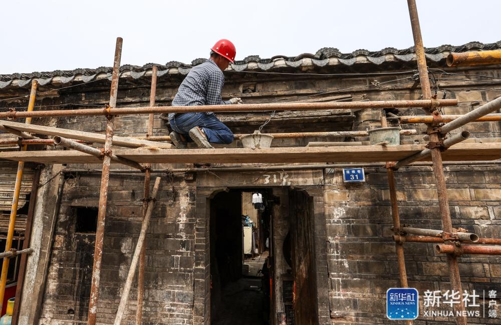 在南京小西湖片區(qū),一名建筑工人在維修老宅的大門(mén)(7月1日攝)。新華社記者 楊磊 攝